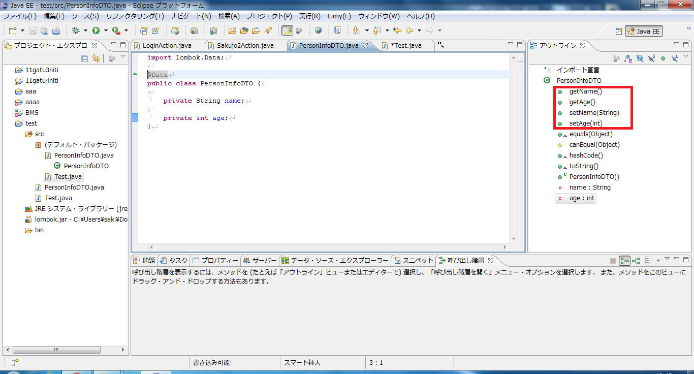 ソース上ではgetter/setterが記述されていませんが、アウトラインにはgetter/setterが表示されています。