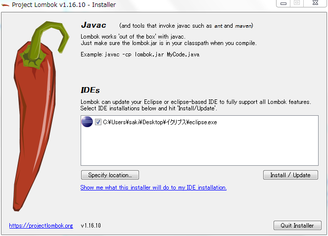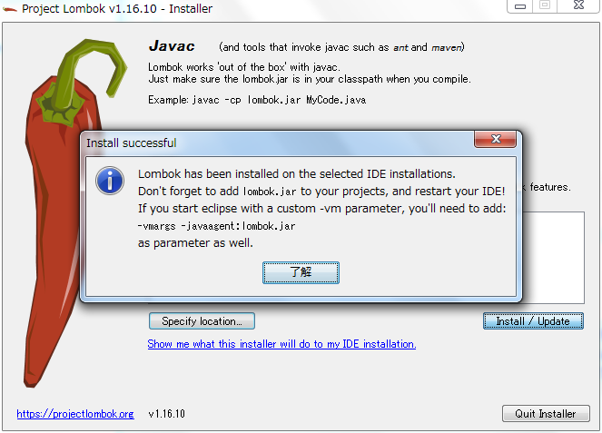 で、lombokをIDEで使用するためにはインストールが必要です。